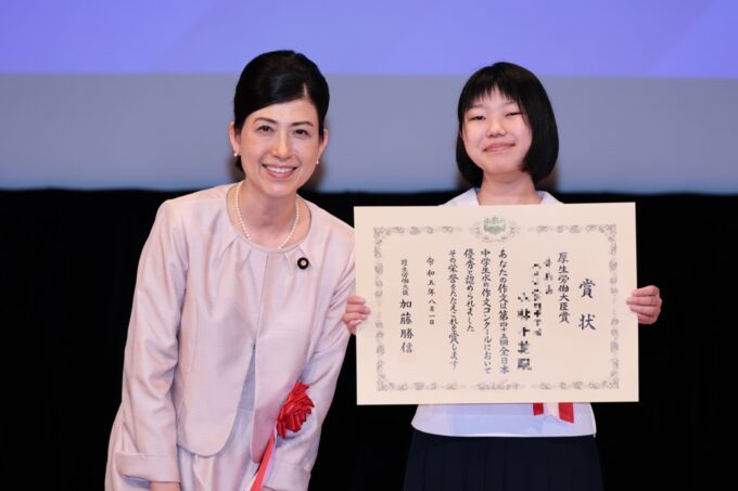 私は厚生労働大臣賞優秀賞の小林知花さんに表彰状を授与させていただきました。